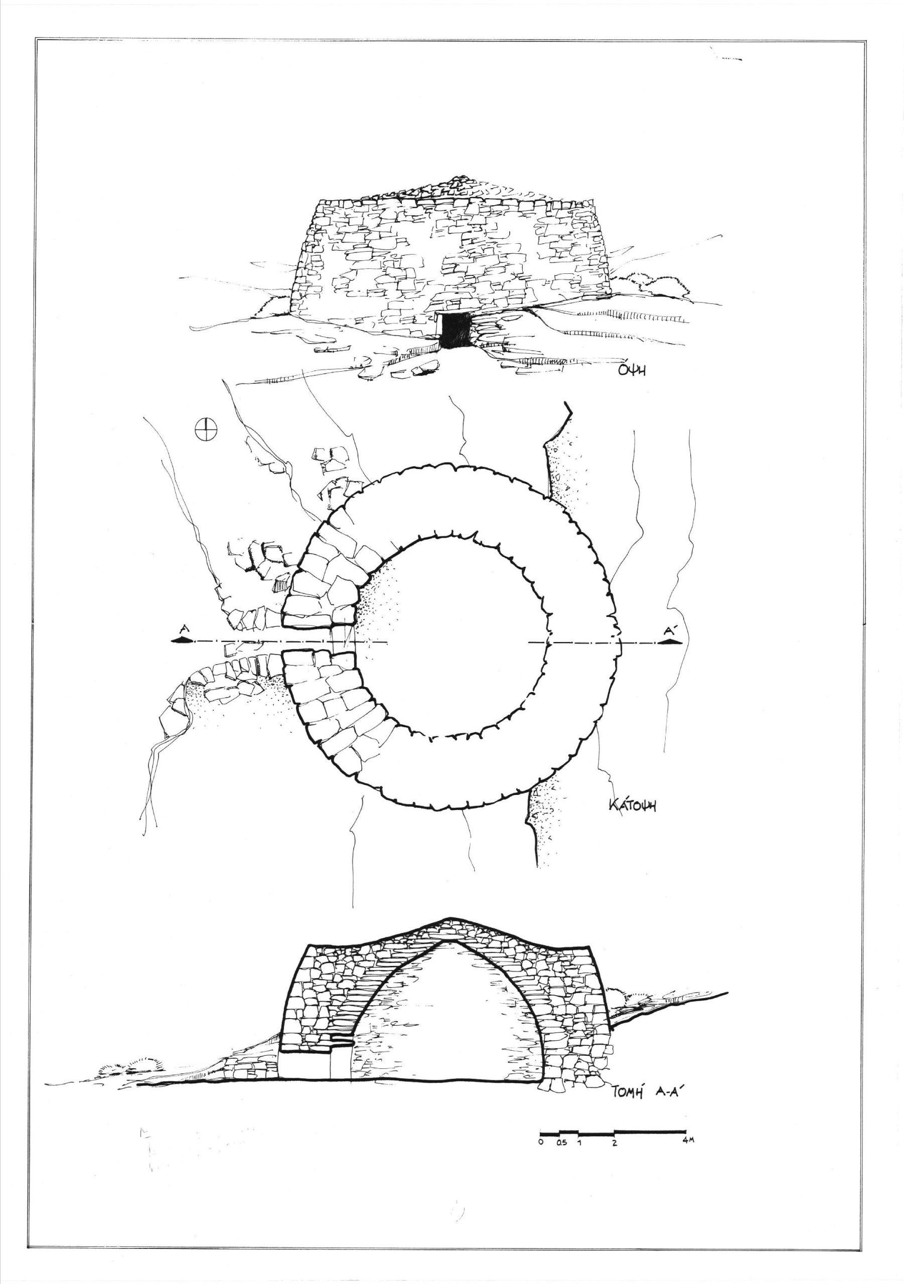 - Στέγαση: Επίπεδη χωμάτινη που στηρίζεται σε ξύλινα δοκάρια, η Θολωτή ξερολιθική στέγη τύπου εκφορικής κατασκευής (θόλος), φτιαγμένη από επίπεδες πέτρες που τοποθετούνται ομόκεντρα έως την κορυφή, χωρίς ξυλεία.