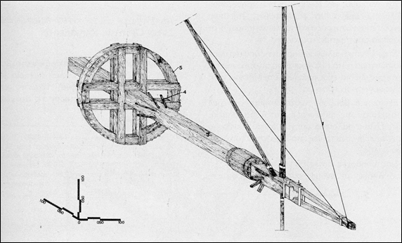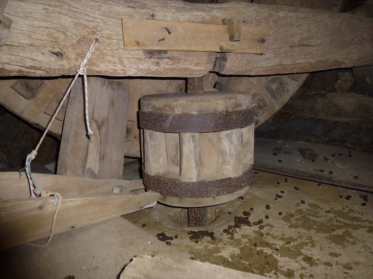Ένα ξύλινο γρανάζι, διαμέτρου περίπου 2 μέτρων είναι προσαρμοσμένο κάθετα στον άξονα και περιστρέφεται μαζί με αυτόν.