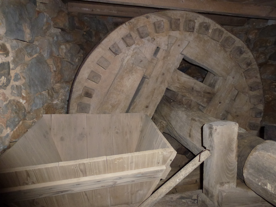 - Τον Μηχανισμός Άλεσης: Περιλαμβάνει τον οριζόντιο άξονα, το κάθετο γρανάζι, τη μυλόπετρα και το σύστημα μετάδοσης της κίνησης.